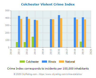 crime rate data displayed above was generated from the trends and crime data available from previous years of actual reported data. In this case, the Colchester crime report data for 2025 was projected from 7 years of actual data. The last year of actual available crime data, as reported above, was 2019.