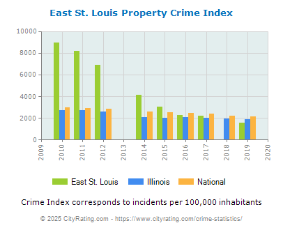 East St. Louis crime statistics report an overall downward trend in crime based on data from 9 years with violent crime decreasing and property crime decreasing. Based on this trend, the crime rate in East St. Louis for 2025 is expected to be lower than in 2019.