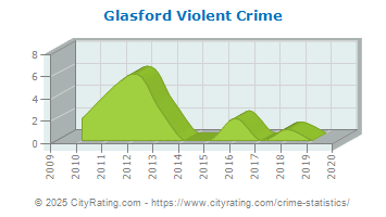 Glasford crime statistics report an overall downward trend in crime based on data from 9 years with violent crime decreasing and property crime decreasing. Based on this trend, the crime rate in Glasford for 2025 is expected to be lower than in 2019.