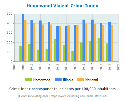 Homewood crime statistics report an overall upward trend in crime based on data from 11 years with violent crime increasing and property crime increasing. Based on this trend, the crime rate in Homewood for 2025 is expected to be higher than in 2019.