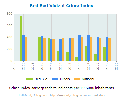 In 2019 the city violent crime rate in Red Bud was lower than the