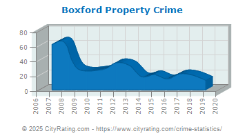 Boxford crime statistics report an overall downward trend in crime based on data from 12 years with violent crime decreasing and property crime decreasing. Based on this trend, the crime rate in Boxford for 2025 is expected to be lower than in 2019.