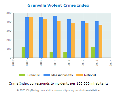Granville crime statistics report an overall downward trend in crime based on data from 6 years with violent crime increasing and property crime decreasing. Based on this trend, the crime rate in Granville for 2025 is expected to be lower than in 2013.