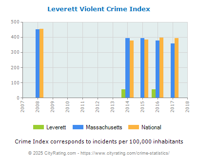 Leverett crime statistics report an overall upward trend in crime based on data from 5 years with violent crime increasing and property crime increasing. Based on this trend, the crime rate in Leverett for 2025 is expected to be higher than in 2017.