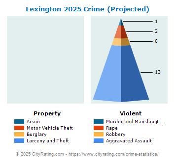 crime rate data displayed above was generated from the trends and crime data available from previous years of actual reported data. In this case, the Lexington crime report data for 2025 was projected from 20 years of actual data. The last year of actual available crime data, as reported above, was 2019.