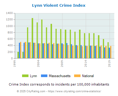 Lynn crime statistics report an overall downward trend in crime based on data from 21 years with violent crime decreasing and property crime decreasing. Based on this trend, the crime rate in Lynn for 2025 is expected to be lower than in 2019.