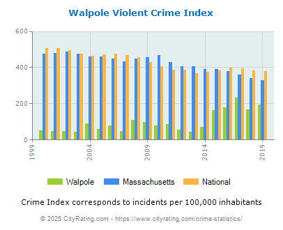 Walpole crime statistics report an overall upward trend in crime based on data from 21 years with violent crime increasing and property crime increasing. Based on this trend, the crime rate in Walpole for 2025 is expected to be higher than in 2019.