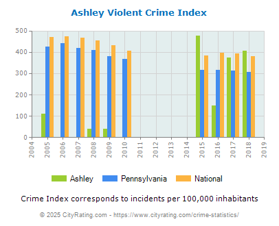Ashley crime statistics report an overall upward trend in crime based on data from 10 years with violent crime increasing and property crime increasing. Based on this trend, the crime rate in Ashley for 2025 is expected to be higher than in 2018.