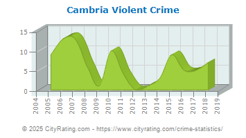Cambria Township crime statistics report an overall downward trend in crime based on data from 14 years with violent crime decreasing and property crime decreasing. Based on this trend, the crime rate in Cambria Township for 2025 is expected to be lower than in 2018.