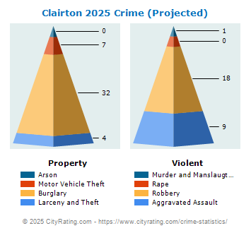 crime rate data displayed above was generated from the trends and crime data available from previous years of actual reported data. In this case, the Clairton crime report data for 2025 was projected from 7 years of actual data. The last year of actual available crime data, as reported above, was 2018.