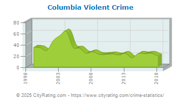 crime rate data displayed above was generated from the trends and crime data available from previous years of actual reported data. In this case, the Columbia crime report data for 2025 was projected from 20 years of actual data. The last year of actual available crime data, as reported above, was 2018.