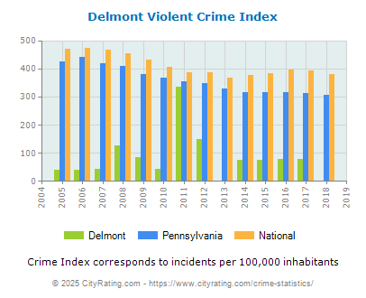 Delmont crime statistics report an overall downward trend in crime based on data from 14 years with violent crime decreasing and property crime decreasing. Based on this trend, the crime rate in Delmont for 2025 is expected to be lower than in 2018.