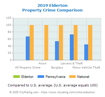 crime rate data displayed above was generated from the trends and crime data available from previous years of actual reported data. In this case, the Elderton crime report data for 2025 was projected from 5 years of actual data. The last year of actual available crime data, as reported above, was 2019.