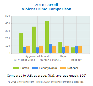 Farrell crime statistics report an overall downward trend in crime based on data from 2 years with violent crime decreasing and property crime decreasing. Based on this trend, the crime rate in Farrell for 2025 is expected to be lower than in 2018.