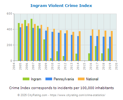 Ingram crime statistics report an overall downward trend in crime based on data from 14 years with violent crime decreasing and property crime decreasing. Based on this trend, the crime rate in Ingram for 2025 is expected to be lower than in 2019.
