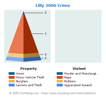 Lilly crime statistics report an overall downward trend in crime based on data from 2 years with violent crime increasing and property crime decreasing. Based on this trend, the crime rate in Lilly for 2025 is expected to be lower than in 2006.