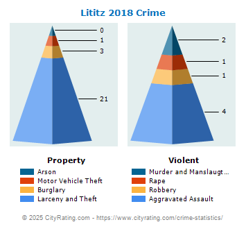 In 2018 the city violent crime rate in Lititz was lower than the violent crime rate in Pennsylvania by 72.33% and the city property crime rate in Lititz was lower than the property crime rate in Pennsylvania by 82.24%.