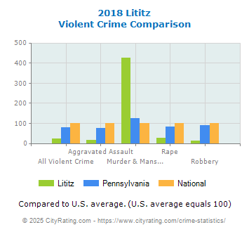 The city violent crime rate for Lititz in 2018 was lower than the national violent crime rate average by 77.75% and the city property crime rate in Lititz was lower than the national property crime rate average by 87.97%.