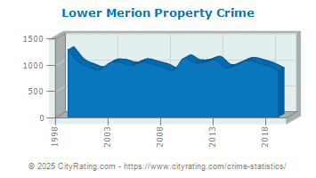 Lower Merion Township crime statistics report an overall downward trend in crime based on data from 21 years with violent crime decreasing and property crime decreasing. Based on this trend, the crime rate in Lower Merion Township for 2025 is expected to be lower than in 2019.