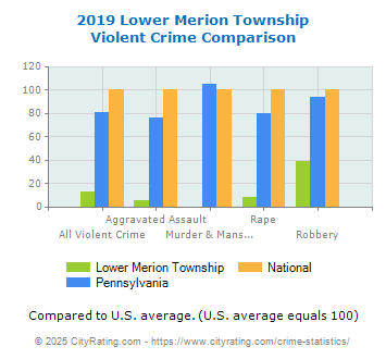 In 2019 the city violent crime rate in Lower Merion Township was lower than the