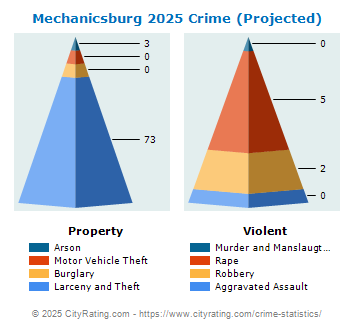 crime rate data displayed above was generated from the trends and crime data available from previous years of actual reported data. In this case, the Mechanicsburg crime report data for 2025 was projected from 14 years of actual data. The last year of actual available crime data, as reported above, was 2019.