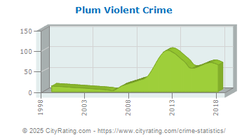 Plum crime statistics report an overall downward trend in crime based on data from 12 years with violent crime increasing and property crime decreasing. Based on this trend, the crime rate in Plum for 2025 is expected to be lower than in 2018.
