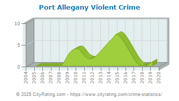 In 2019 the city violent crime rate in Port Allegany was lower than the violent crime rate in Pennsylvania by 83.69% and the city property crime rate in Port Allegany was lower than the property crime rate in Pennsylvania by 89.32%.