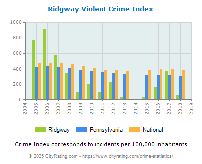 The city violent crime rate for Ridgway in 2018 was lower than the