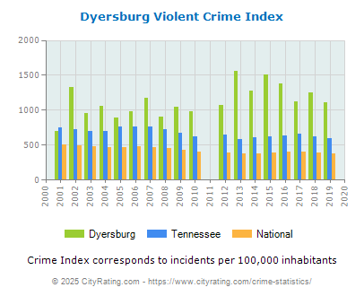 In 2019 the city violent crime rate in Dyersburg was higher than the