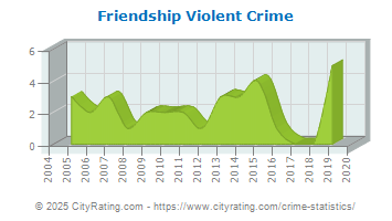 Friendship crime statistics report an overall downward trend in crime based on data from 15 years with violent crime decreasing and property crime decreasing. Based on this trend, the crime rate in Friendship for 2025 is expected to be lower than in 2019.