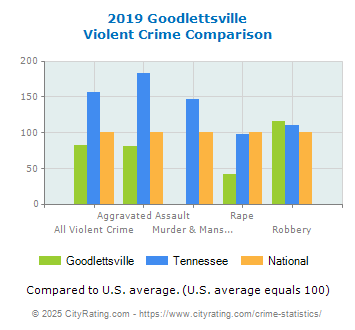 In 2019 the city violent crime rate in Goodlettsville was lower than the