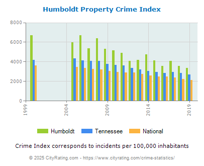 In 2019 the city violent crime rate in Humboldt was higher than the violent crime rate in Tennessee by 29.64% and the city property crime rate in Humboldt was higher than the property crime rate in Tennessee by 25.58%.