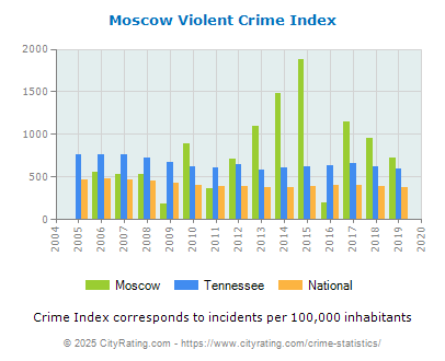 In 2019 the city violent crime rate in Moscow was higher than the violent crime rate in Tennessee by 20.22% and the city property crime rate in Moscow was lower than the property crime rate in Tennessee by 25.82%.