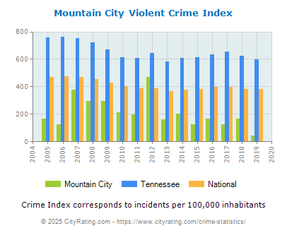 In 2019 the city violent crime rate in Mountain City was lower than the violent crime rate in Tennessee by 93.02% and the city property crime rate in Mountain City was lower than the property crime rate in Tennessee by 46.75%.