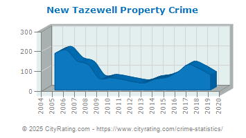 In 2019 the city violent crime rate in New Tazewell was lower than the violent crime rate in Tennessee by 56.47% and the city property crime rate in New Tazewell was higher than the property crime rate in Tennessee by 6.04%.