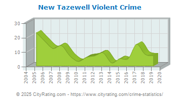 New Tazewell crime statistics report an overall downward trend in crime based on data from 15 years with violent crime decreasing and property crime decreasing. Based on this trend, the crime rate in New Tazewell for 2025 is expected to be lower than in 2019.