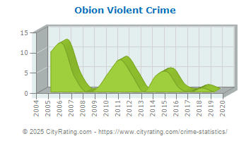 Obion crime statistics report an overall downward trend in crime based on data from 15 years with violent crime decreasing and property crime decreasing. Based on this trend, the crime rate in Obion for 2025 is expected to be lower than in 2019.