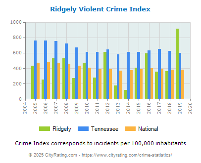 In 2019 the city violent crime rate in Ridgely was higher than the violent crime rate in Tennessee by 53.58% and the city property crime rate in Ridgely was lower than the property crime rate in Tennessee by 56.35%.