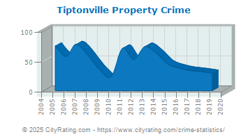 In 2019 the city violent crime rate in Tiptonville was lower than the violent crime rate in Tennessee by 41.2% and the city property crime rate in Tiptonville was lower than the property crime rate in Tennessee by 74.49%.