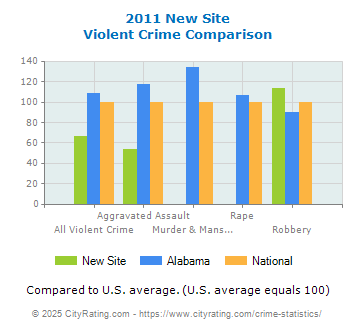 New Site crime statistics report an overall upward trend in crime based on data from 3 years with violent crime increasing and property crime increasing. Based on this trend, the crime rate in New Site for 2025 is expected to be higher than in 2011.