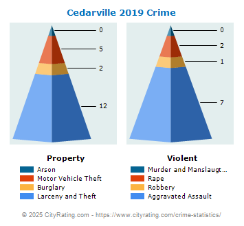Cedarville crime statistics report an overall upward trend in crime based on data from 2 years with violent crime increasing and property crime increasing. Based on this trend, the crime rate in Cedarville for 2025 is expected to be higher than in 2019.