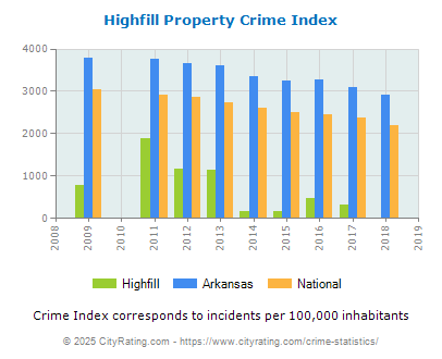 Highfill crime statistics report an overall downward trend in crime based on data from 9 years with violent crime increasing and property crime decreasing. Based on this trend, the crime rate in Highfill for 2025 is expected to be lower than in 2018.