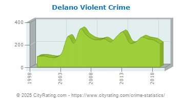 Delano crime statistics report an overall downward trend in crime based on data from 21 years with violent crime increasing and property crime decreasing. Based on this trend, the crime rate in Delano for 2025 is expected to be lower than in 2019.