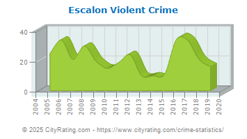 Escalon crime statistics report an overall downward trend in crime based on data from 15 years with violent crime decreasing and property crime decreasing. Based on this trend, the crime rate in Escalon for 2025 is expected to be lower than in 2019.