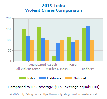 Indio crime statistics report an overall upward trend in crime based on data from 21 years with violent crime increasing and property crime decreasing. Based on this trend, the crime rate in Indio for 2025 is expected to be higher than in 2019.