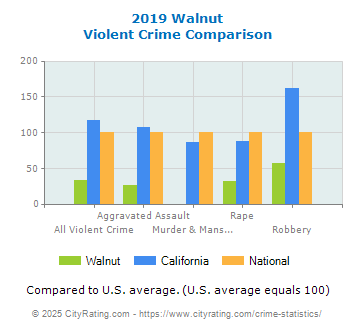 Walnut crime statistics report an overall downward trend in crime based on data from 21 years with violent crime decreasing and property crime decreasing. Based on this trend, the crime rate in Walnut for 2025 is expected to be lower than in 2019.