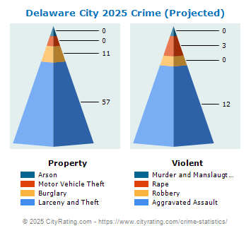 crime rate data displayed above was generated from the trends and crime data available from previous years of actual reported data. In this case, the Delaware City crime report data for 2025 was projected from 15 years of actual data. The last year of actual available crime data, as reported above, was 2019.