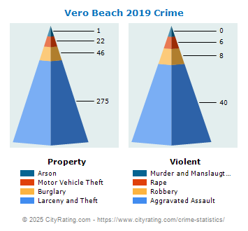 Vero Beach crime statistics report an overall downward trend in crime based on data from 21 years with violent crime decreasing and property crime decreasing. Based on this trend, the crime rate in Vero Beach for 2025 is expected to be lower than in 2019.