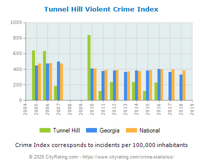 In 2018 the city violent crime rate in Tunnel Hill was lower than the