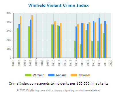 crime rate data displayed above was generated from the trends and crime data available from previous years of actual reported data. In this case, the Winfield crime report data for 2025 was projected from 10 years of actual data. The last year of actual available crime data, as reported above, was 2019.